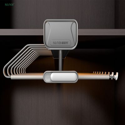 A space-saving, built-in wardrobe accessory designed to store trousers, skirts, ties, or scarves neatly and accessibly. Mounts to the top interior of a wardrobe/closet with a sliding rail system for smooth operation.