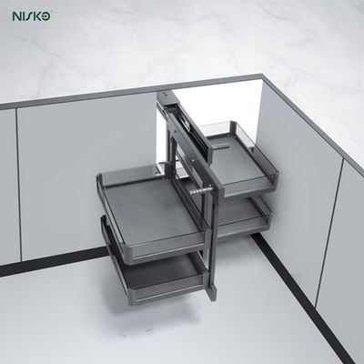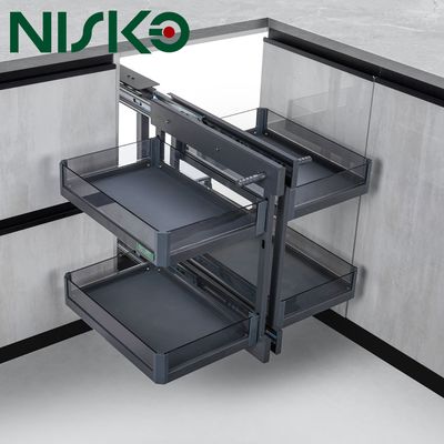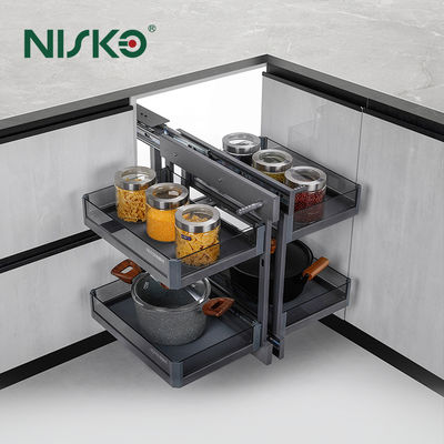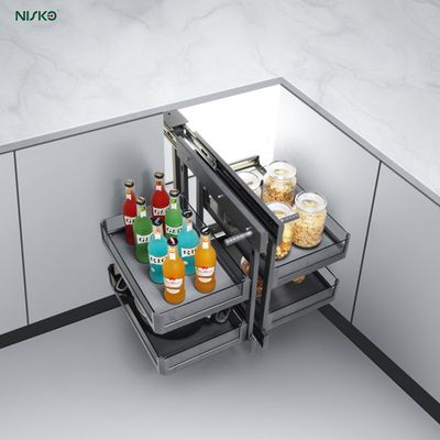 This "magic corner" solution turns a dead zone into a highly accessible storage hub, ideal for small kitchens or modern layouts.