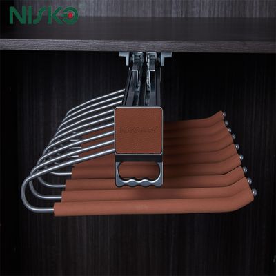 Upgrade your closet with the Top Mount Soft-Closing Pant Rack. This sleek, single-row organizer features a retractable pull-out rail and silent soft-close mechanism to prevent slamming. Built with a durable mocha aluminum frame and a luxury amber brown leather-wrapped bar, it offers wrinkle-free storage for up to 9 pairs of pants while adding a refined, modern touch to your space.
