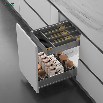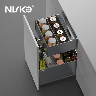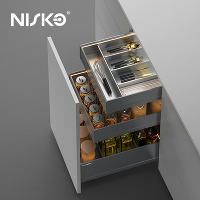 Features a minimalist, industrial-style finish that complements modern cabinetry. Includes built-in LED lighting that illuminates contents when the drawer opens—enhancing visibility and adding a touch of luxury.