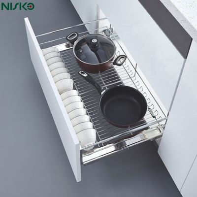 Features a two-tier pull-out basket design that maximizes vertical space in deep drawers—perfect for organizing pots, pans, plates, bowls, utensils, and more in one accessible unit.